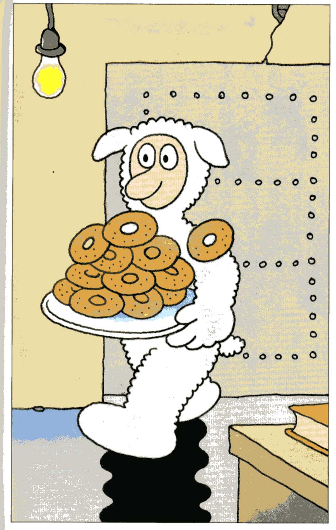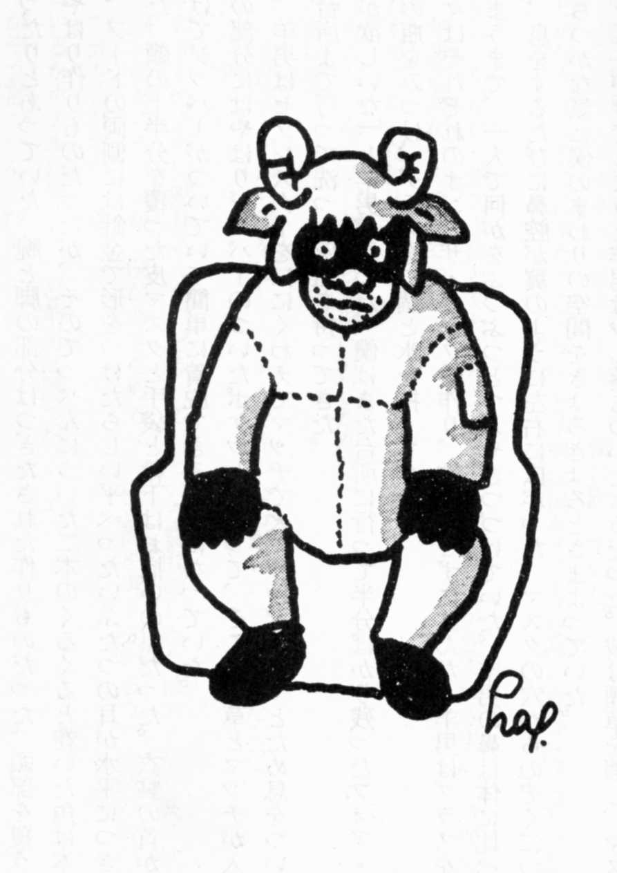 若葉―で、羊男って、毛皮を着たヒトのわけ? 図書館のオネエサン― ハルキ君が会った羊男は何人もいるようですね。 子どもの頃図書館で会った羊男は、ドーナツ好きです。(※1) ほかの本には、羊男は、羊学校へ行って、研修受けて、羊男になったって書いてます。羊の衣装も、夏用・冬用があるし、都会のアパートに住んで、ドーナツ屋で働いてます。(※2) 大人になってから会った羊男は、体型がずいぶん違うし、山奥に住んでいるので、登山靴を履いてます。(※3、図) 若葉― じゃあ、ドーナツは食べない? 何食べてるの? 図書館のオネエサン― 蕗、ぜんまい、木の実、鳥、小さな魚やかに、ですって。 三太― ハルキが会ったときは、酒も飲んだし、タバコも吸ってるね。 図書館のオネエサン― 衣装のお尻にはちゃんと小さな尻尾もあって、後から見ると本物の羊に見えるのに、「腕の部分にはやはりジッパーのついたポケットがあって、そこに煙草とマッチが入っていた。」ですって。 若葉― やぁだぁ、タバコなんて、ダサ〜イィ! ※1 『ふしぎな図書館』村上春樹、画・佐々木マキ、講談社文庫、2008第一刷 |