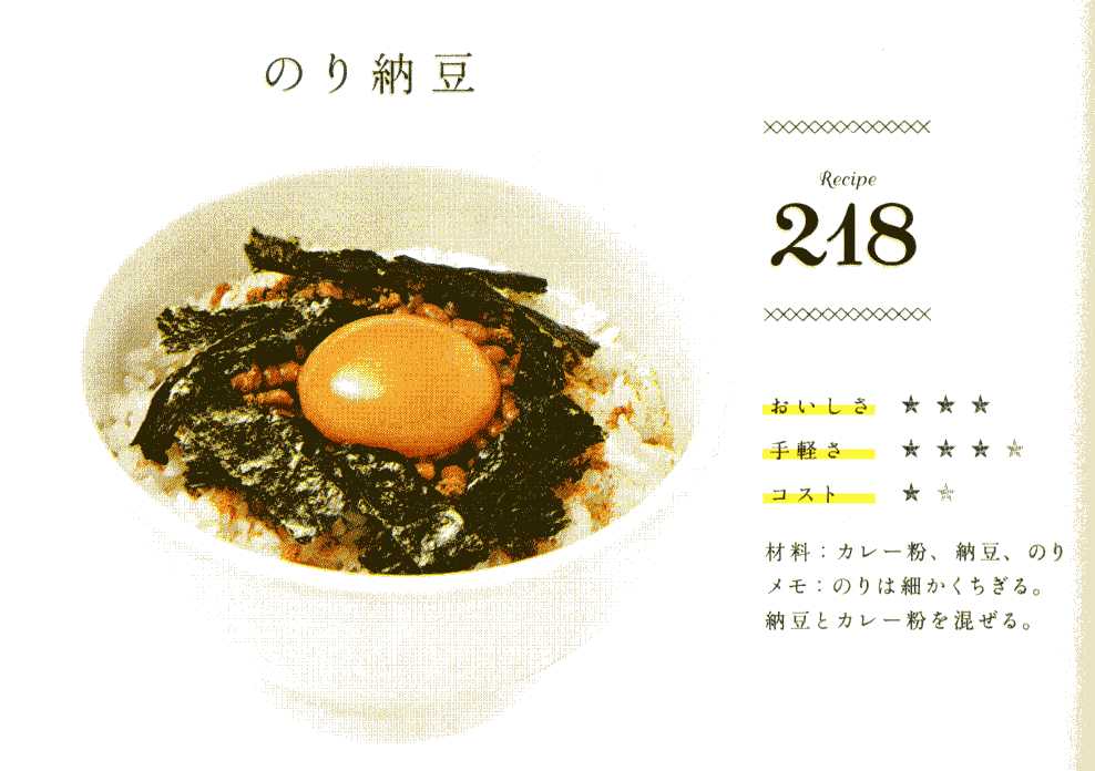 | 王子第二小学校(=王二(おうに))の卒業生― お稲荷さんの初午のとき、見世物小屋、そう、ありましたね(※1)。 お稲荷さんの境内で映画、美空ひばりの時代劇がかかってましたね、懐かしい! 王二の校庭で映画とか・・・夏休みは毎朝ラジオ体操ではんこを押してもらったとか・・・懐かしい! 西東京のおばさんは、子どもの頃、生卵の、それも黄味だけを飲んだ。 おかあが紹介した【たまたまごはん】は玉子なしの醤油ご飯だった(※2)が、いまどきは、玉子かけご飯と言えば、トッピングがつきものだ。 ネット「全国のたまごかけごはん」(※3)で見たら、「全国人気トッピング ランキングBEST5」は、1位のり、2位ネギ、3位だし醤油、4位かつおぶし、5位粉チーズ、だと。 『たまごかけごはん300』(※4)ってえ本は、調味料別のレシピをた〜くさん載せている。 いわく―醤油、ケチャップ、マヨネーズ、白みそ、オリーブ油、ゴマ油、コンソメ、カレー粉、その他。 具材は、要するに、白いお米のごはんの上に、ありとあらゆるモノをのっけてみてます、って感じ。 (写真は「218 のり納豆」) おかあ、納豆が気になってチェックしてみた。 納豆を使ったレシピは8点。合わせるモノは、調味料は「醤油、マヨネーズ、からし、ソース、オリーブ油、ゴマ油、コンソメ、カレー粉、麺つゆ、」具材は「青のり、かつおぶし、梅肉、イカソーメン、万能ねぎ、のり、豆腐、おくら」 おかあのこった、数え落としてるかもしれねんで、「たまごかけごはん番外編 ごはん以外」ってページ見たら、「297 麦チョコ」ってのがある。 麦チョコ??? ※1 (406) 三太・○○焼き(その一三)王子稲荷 一番上にもどる |