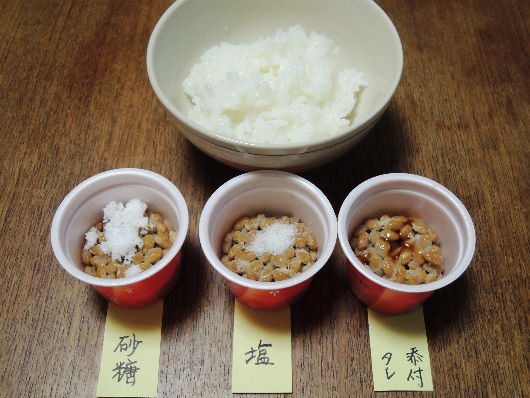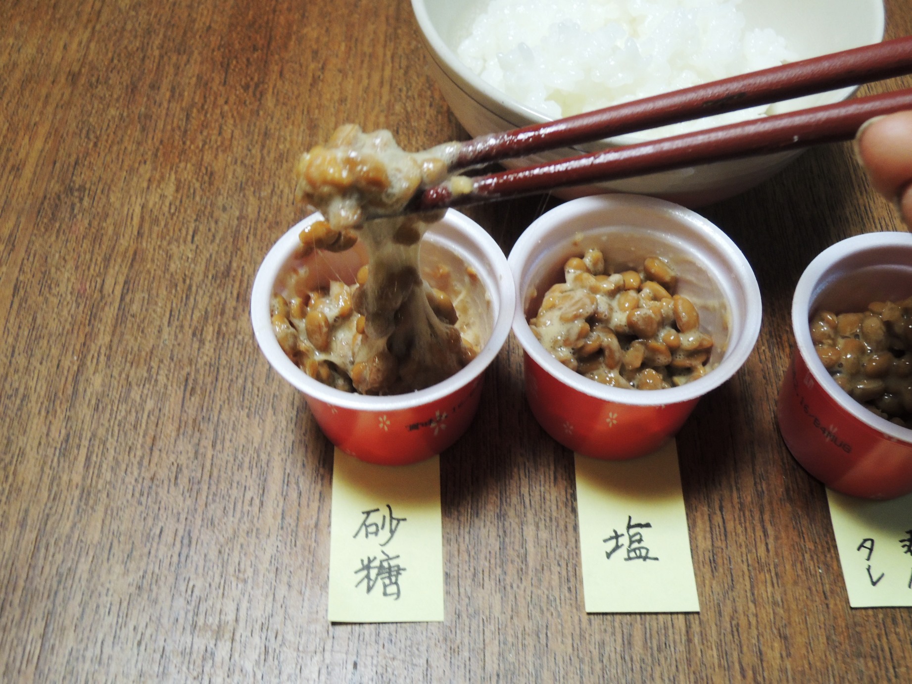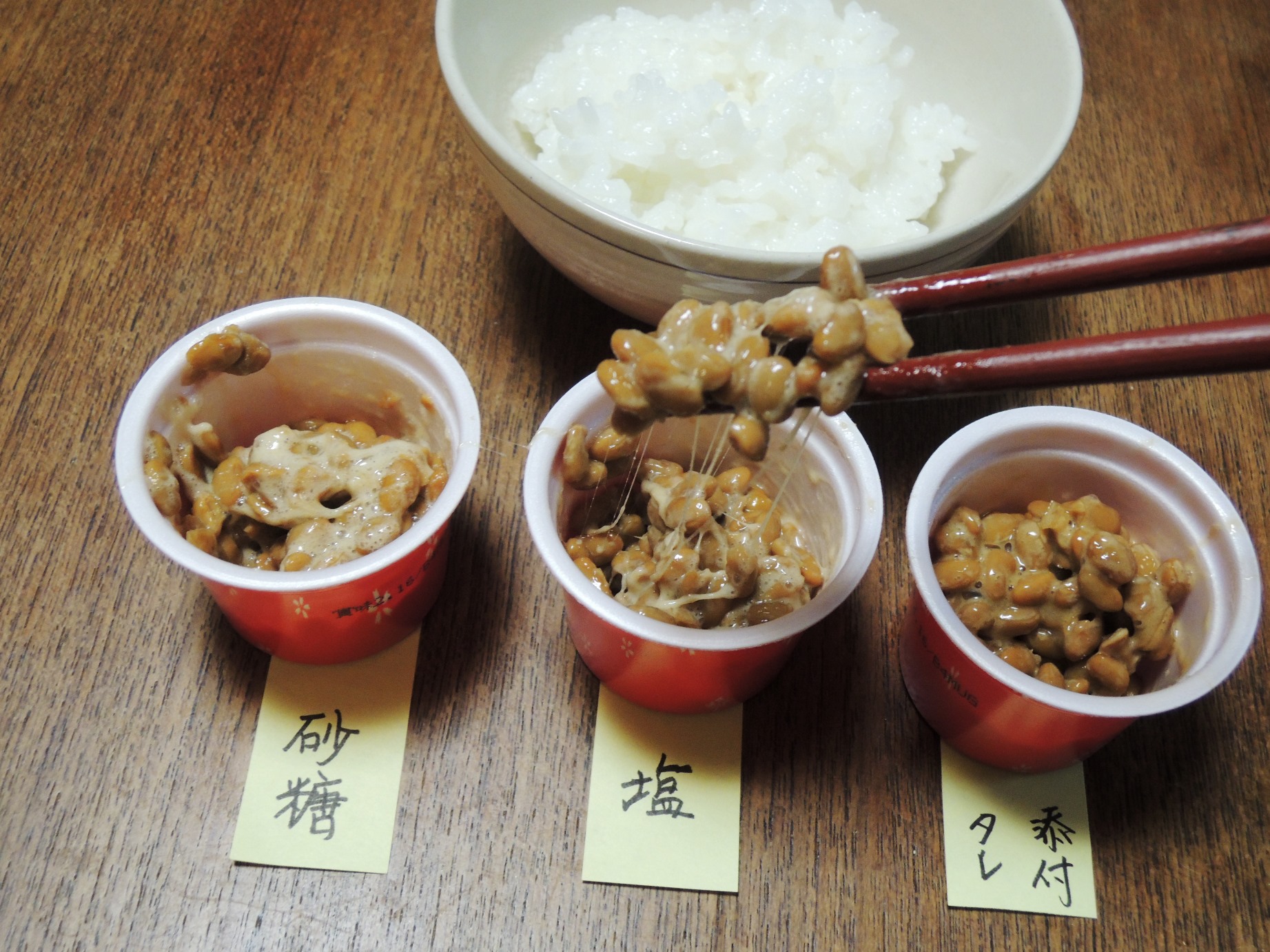 | 京都育ちの「今年、喜寿」さん― 私も連れ合いも、子どもの頃、納豆食べたことないので、納豆の話、面白く読んでます。 京大宇治分校(当時こちらで授業がありました)の学食では納豆があったかと記憶します。もちろん食べたことはありません。 ぼくが納豆を食べるようになったのは、東京に来てからです。 連れ合いは今もってそれを嫌悪し、ぼくが納豆を食べた後は、必ず自分で食器洗いをすることになっています。 京都人の食に対する保守性はあきれるほどです。 おかあ― 【食の好みは、保守的なものだ】というのが、私の持論なんですが、お連れ合いは徹底してますねぇ。 私が学食の小鉢に、納豆を見かけるようになったのは、いつ頃かな・・・ 野瀬さんが、工場で作られコールド・チェーンで運ばれてスーパーの冷蔵ケースに並べられる納豆は、低温に保たれるから、途中で発酵が進まない。だから、季節も地域もかまわずに、「給食や大学食堂でも年間を通じて供給され」るって、書いてます(※1−1)。 うちでは、1975年頃までは、買ったその日に食べるモノでした。翌日にはおいしくなくなったから。 密封パックの商品が並ぶようになってから、買い置きしてもいい、って感じになりましたね。 で、なんで、納豆に砂糖を入れるんだろ? 野瀬さんは、「甘い赤飯」「砂糖入り茶わん蒸し」の、北海道、青森3、秋田の3道県を甘味トリオと呼んでいる(※2)。 納豆に砂糖を入れる所と重なってる、寒い所のヒトは甘い物が好きなのか? 野瀬さんがいうには「納豆に砂糖を入れるのは甘みを加えるのではなく糸がよく引くようにするためだ、というメールを紹介した。・・・。私たちは納豆に砂糖、塩をそれぞれ加え、同じ回数かき混ぜるという実験をした。糸の引き具合を調べるためである。結果は「塩を入れると糸がすげえ」であった。「砂糖を入れるともっとすげー」であった。」(※1−2) おかあ、野瀬さんと同んなじに、実験してみる。(写真)