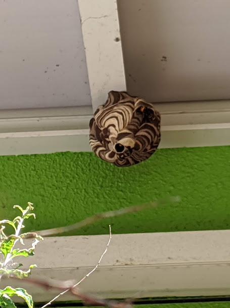 | アルフレッド― 女将さん、朝早くから騒いで… 女将― だって、起き抜けに玄関のドアを開けたら、足もとにスズメバチが一匹、頭の上にスズメバチの巣!(→写真) いっつのまに、こんなに大きくなったんだろ、ソフトボールくらい。 びっくりして見てる間にも、スズメバチが3匹か4匹、巣に出入りしてる… アルフレッド― 女将さん、三太君が襲われたときのことが蘇って、震えてます。(※1) 立川の先生が襲われたこと、オレンジさんの家の大きな巣の写真… 三太―それで、どうしたんだ? 女将(=おかあ)― 気を取り直して、市役所に電話した。 電話の交換手さんに 「家にハチが巣を作ってるんです。どこの課に相談したらいいですか?」 そしたら、市役所の中の担当部署に回してくれて、そこの人から、紹介、紹介で、 市内の近くの駆除業者にたどりついて、出張駆除を依頼した。 刺されてからじゃ、お金に代えられないから。 アルフレッド― 夕方近くに、男性二人が来て、駆除作業をしてくれました。 宇宙服みたいな、防護服着て。 駆除業者さんの話では、ハチだけでなく、アライグマ、ハクビシンも横行してるそうです。横浜市ではネズミ。 女将― 共生するって、難しいことだねえ… ※1