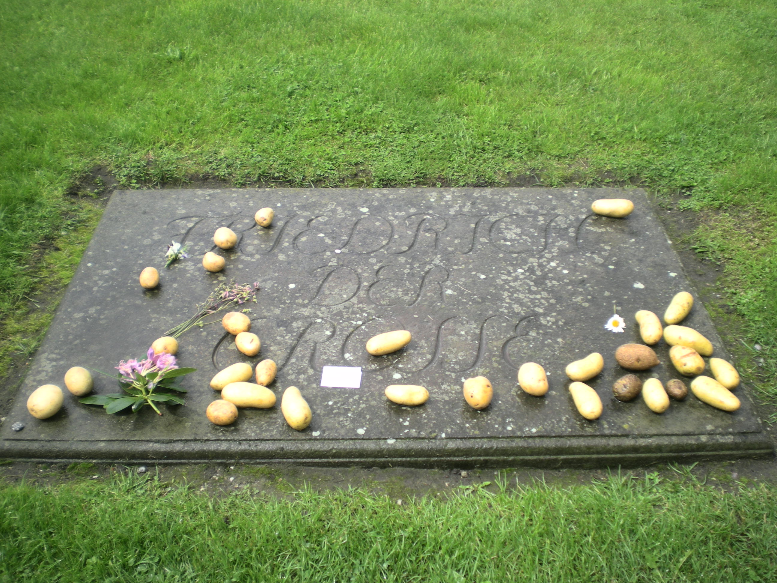 なんで? ヤギ生徒、ずーっと前、『ジャガイモ談義』(※1)を連載するとき、ジャガイモのこと、ひととおり読んだんだが、フリードリッヒ大王のこた、知らなかった。 ドイツじゃあ、フリードリッヒ大王が命令まで出して、ジャガイモ栽培を奨励したんだと。 ベルリンの先生― フリードリッヒ大王のジャガイモ奨励命は彼がブレスラウにいた時、1756年3月24日、と1757年4月5日の2回発しています。ポツダムでも奨励命を出したはずと思われますが、記録がないそうです。 当時は飢饉に見舞われた農民は餓死したのですが、ジャガイモの栽培に成功することで、餓死者がなくなったそうです。 奨励はしたものの、なかなか普及しないので、フリードリッヒは次のようなアイデアを考え付いたそうです。 ジャガイモを植えつけた畑には、昼間兵隊を見張りに立たせるが、夜は立たせない。農民達は、兵隊たちが見張りに立ってまで盗むのを防止するとは、貴重なものに違いないと考えるに違いないと。 フリードリッヒのお墓には通常ジャガイモが供えてあります。サンスーシ宮殿のガイドは、「フリードリッヒに感謝しているのです」と説明しました。「誰がお供えするのですか」と聞くと、「ここにやってくる人が」とのことです。昔はジャガイモがお供えしてあることは少なかったと記憶してますから、ジャガイモを供えることが流行ってるのかもしれません。 うん、なるほど、2008年に出た本(※2)の写真にゃ、王様のお墓にジャガイモは載ってねい。ベルリンの先生の言うように、このごろの流行りなのかも。