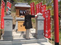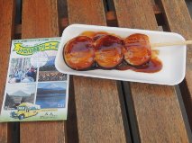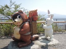 | おかあのバス、3年前は鬼怒川で「鬼怒太」とイワシの缶詰に会った(※1)。 去年は小田原でおはぎと蒲鉾(※2)。 今年は河口湖、何に出会うだろう。 「たぬき団子」があるってチラシ見て、皆を引っぱって、カチカチ山に登る。 もちろん、歩きじゃなくって、ロープウエーで。 山頂のたぬき茶屋でたぬき団子300円也を食べて一服(→写真)。