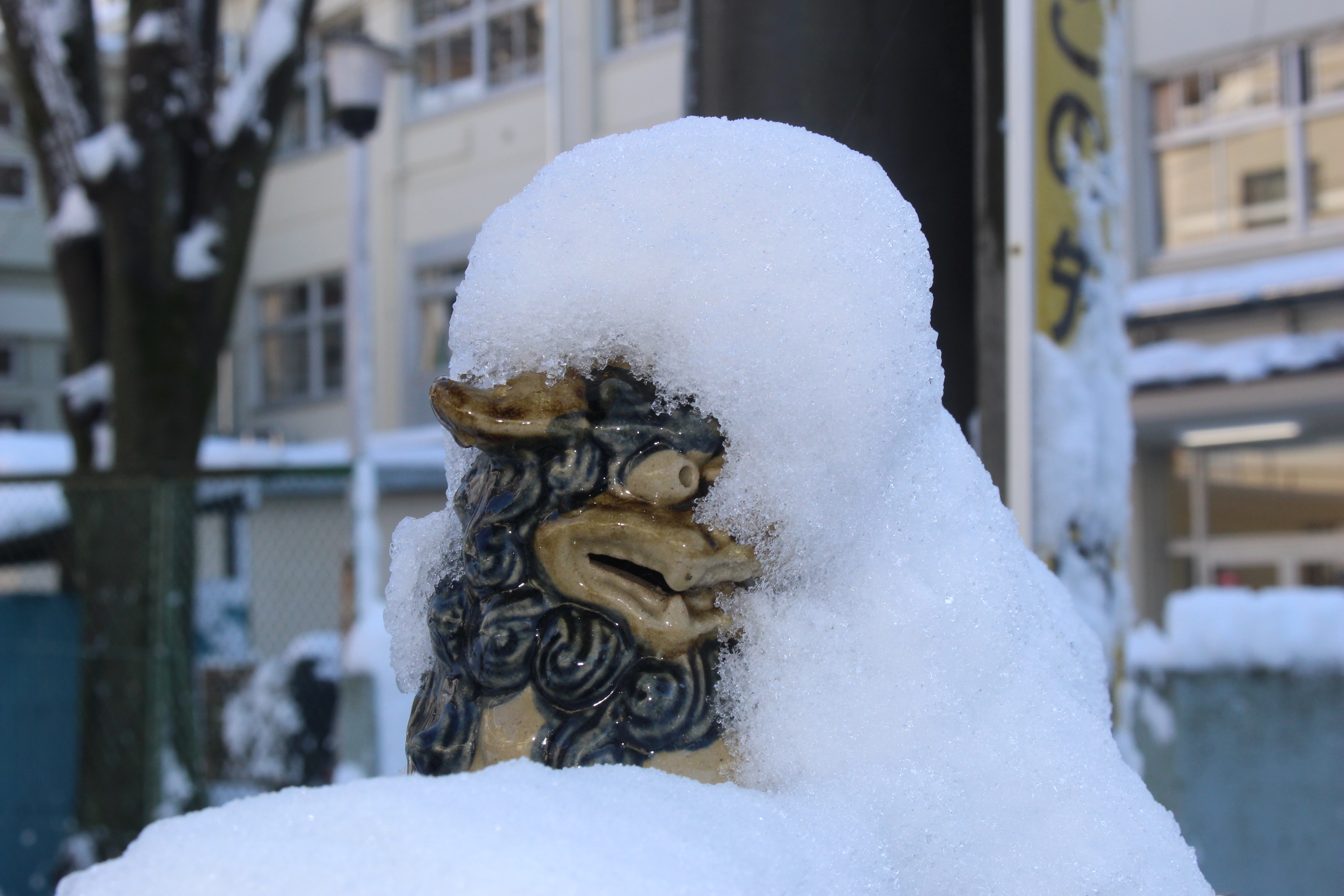 “ぼくは、4ねんせいで、おとうとの ゆうじは 2ねんせいだ。” 鉄道マニアの兄弟は、お年玉をはたいて、越後湯沢までの切符を買った(※1)。 雪が降っているところへ行ってみたい、って。 関東平野に住んでると、雪はわざわざ、見に行くものなんだ。 と思ったら、4年ぶりの大雪(※2)、積もらないうちに、っておかあと散歩に出たが、おらの足がもぐって、腹に雪が付きそうになる。 短足どころか、足無しだ、幽霊だって言われそうなんで、早々に切り上げて帰った。 夜のうちに20センチ積もった。 2018年1月22日からの大雪。東京では23日朝までに降りやんで青空が出たが、全国的にはさらに強い冬型の気圧配置が続いて、「列島、凍結」という見出しも載ってる。(※3) 皆さんに、「酷寒お見舞い申し上げます」 翌朝、おかあ、うちの前の道路の雪かき。 車と人が通れる幅を確保し終えて、雪スコをかたづける。 ふと見上げたら、門柱の上のシーサーが雪だるまになってる!(写真1) おかあ、雪スコをまた持ち出した。 いつまで、雪かきやってんだ? おかあ― シーサーが泣きべそかいてるから、相棒を作ってやってるのよ。 三太― 沖縄からおかあに連れられて来たシーサー、おらよりずっと年上だ。 ある嵐の夜に、「うん」は<風と共に去りぬ>。 以来、「あ」は独り、むらき家の門を守り続けて15年。 南国生まれの「あ」、身長15センチ。(写真2) おかあが作った雪の「うん」、身長80センチ。(写真3) おかあ― 「あ」に似せて作ったんだけど、籠神社(このじんじゃ)の狛犬(※4)に似ちゃった。 アルフレッド― ねずのおじさんの分類を借りれば、「ア・ウン・ヨコ・タテ」型ですね。