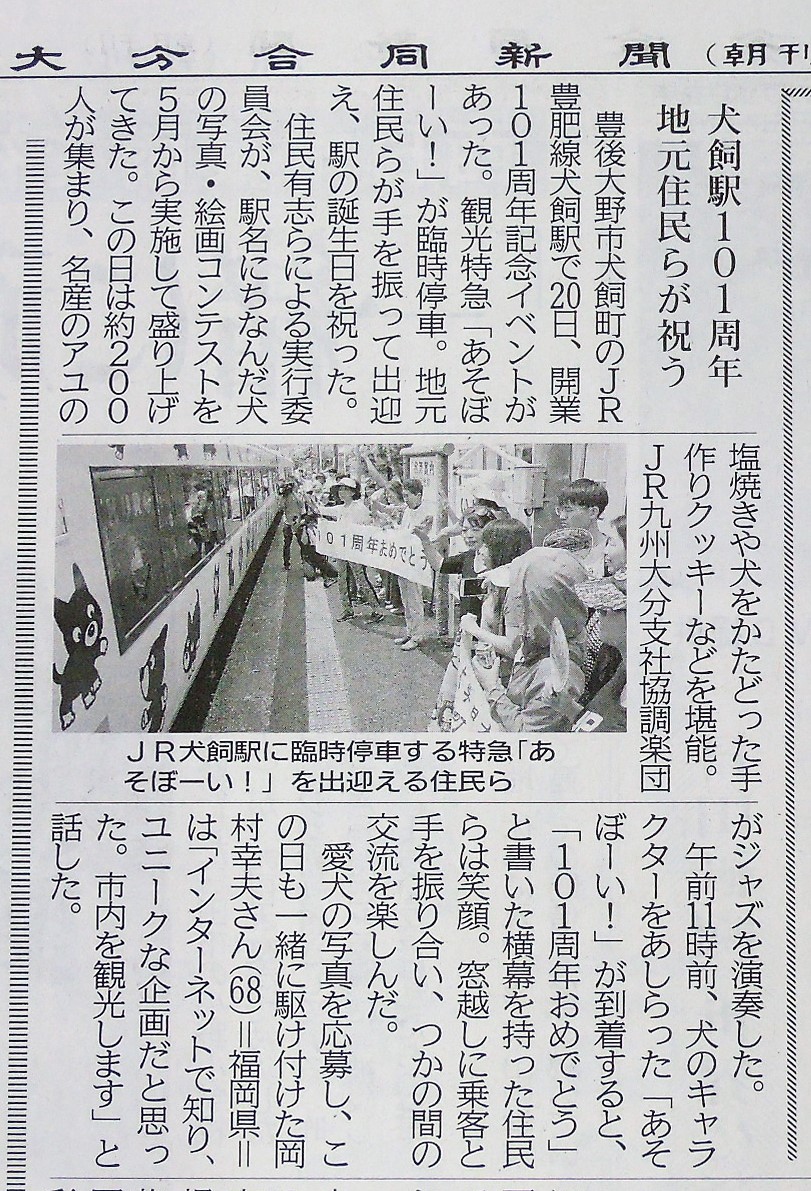 おかあ― 生野菜が摂りにくいのよね、旅行中って。 アルフレッド― 女将さん、どこ行ってたんです? おかあ(=女将)― 大分。 大分駅前、発車寸前のバスに飛び乗って、やれやれと思ったら、別方向だった。 しょうがないからバス降りて歩き始めたんだけど、カンカン照り。 日傘さして、ヒイヒイ言いながら歩いて行ったら県庁のビルが見えた。 官公庁なら地下に食堂があるはずだ、って、入って行った。 そしたら9階に展望の良い食堂があって、昼食バイキングが750円、生野菜も摂れたし、デザートに大分名物の「やせうま」(※1)も。 リーズナブル! 三太― おかあ、豊肥本線に乗って、豊後大野市犬飼町へ行く。 地元のおねえさん曰く― 「きのう、犬飼駅開業101年のイベントやってたんですよ」 観光特急「あそぼーい!」が臨時停車したし、「101周年わんわん総選挙」の投票結果発表があったんだと。(※2) おかあ、総選挙があるって知ってたらおらの写真を応募したのに、って、残念がる。 『デトロイト・メタル・シテイ』っていうアニメの聖地なんだってことも、帰宅してから分かった。 そりゃ、事前調査が不十分だったってえことだ、反省猛省すべきだ。 おかあが駅舎へ戻ると、柴犬はなちゃんが迎えてくれた。 総選挙で堂々の第一位に輝いた、犬飼駅の名誉駅長だ。 真向かいの自宅から毎日毎夕、駅に通って、待合室で乗降客を送迎している、無人駅の実質駅長、写真は『朝日新聞』(※2−2)にもバッチリ載ってる。