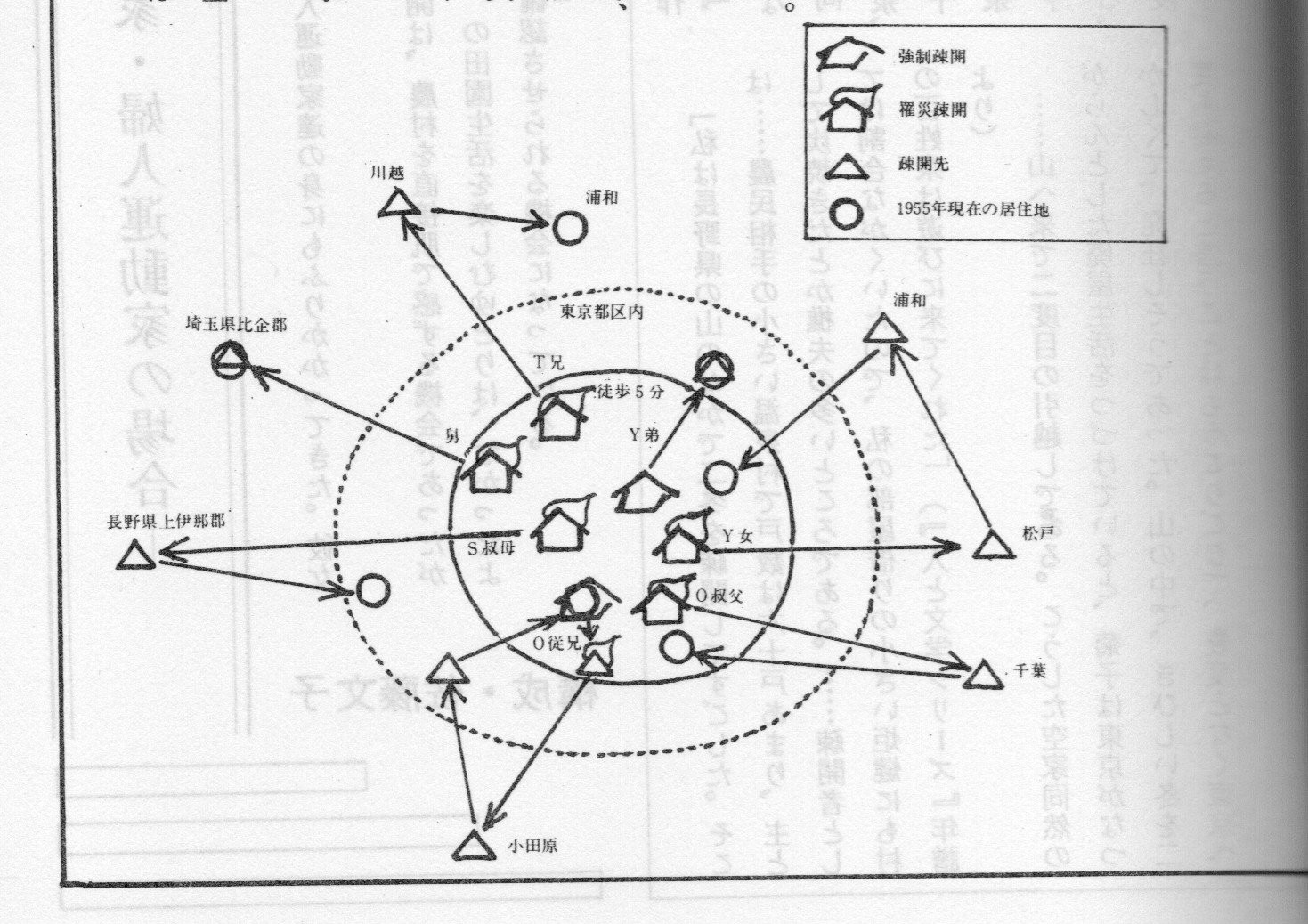 ![]() 王子区に住んでいた7家族(Y夫婦とその親族)の疎開による移動の軌跡 (「或る解体」p95) |