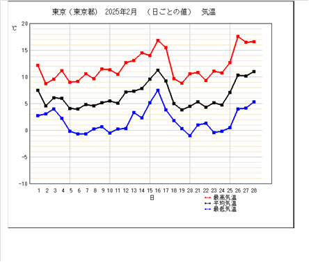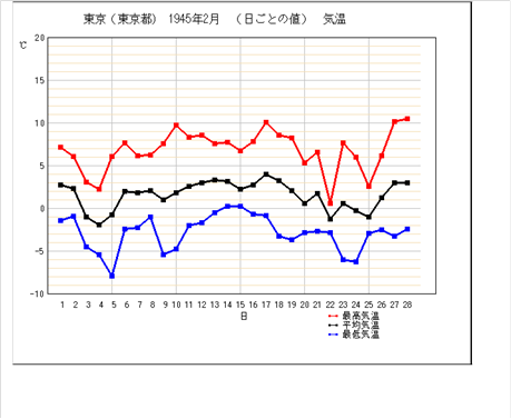 | アルフレッド― 葉桜の季節になりました。 石鍋秀子さんの描いた地図(※1)では、左の端っこになっていますが、【飛鳥山】は江戸時代に将軍が桜を植えさせて以来の、お花見の名所です。 明治以降も、昭和になっても、上野とともに東京の二大桜名所で、花見電車が増発されたり、大混雑。 飛鳥山から音無川、王子の町にかけて、料理屋・映画館、三業地など、繁華街でした(※2)。石鍋商店は、飛鳥山→音無川→王子神社→石鍋商店→王子稲荷→名主の滝、という観光コースの、真ん中です。 「マニアックな読者」さんから、1945年4月の上野の山の桜について投稿いただきました。(※3) “三月十日の初の大空襲に十万ちかい人が死んで、その死者を一時上野の山に集めて焼いたりした。 まもなくその上野の山にやっぱり桜の花がさいて、しかしそこには緋のモーセンも茶店もなければ、人通りもありゃしない。ただもう桜の花ざかりを野ッ原と同じように風がヒョウヒョウと吹いていただけである。そして花ビラが散っていた。” マニアックな読者― 当時、中央気象台が制作していたアジア太平洋地上天気図と日ごとの気温データ(インターネットで閲覧可能)から1945年2月から4月の東京の気象(午前6時と午後6時)を再現してみる。 三太― 気象を再現してみる? アメリカ相手に戦争を始めたとたんに、「天気予報」がなくなった、って聞いたぞ。 マニアックな読者― 「天気予報」を新聞やラジオで公表するのが禁止されたのであって、気象観測は継続していた。(※4) 気象情報・天気予報は軍事機密とされて1941年12月8日の開戦とともに公表が禁止され、1945年8月22日に再開されるまで、台風をはじめとする防災情報を国民が得られない状態が続いた。一方、米軍は日本の気象情報の暗号を解読するとともに、南方の気象観測結果を平文で発信した。敗戦直前の中央気象台はこの米軍情報を採り入れて、南方海上の台風進路などを把握していたという。 東京の1945年2月は最低気温が0℃をわずかに超えた日が2日あるだけで、26日は0℃以下が続き、マイナス5℃以下の日も5日あった。 これは最低気温がマイナスになった日が7日しかない(しかも最低値はマイナス1℃)。2025年2月と比べると著しい差があり、近年の地球温暖化の表れとみられる。(→グラフ) しかし、前後の1944年・1946年の2月と比べても、1945年は最低気温・最高気温とも低い傾向が明らかであって、1945年2月の東京が寒冷であったことが分かる。 なお、1945年の日本列島が大豪雪・大冷夏であったとして「終戦」との関係を論じた研究に山内大輝「終戦を促した異常気象 ~昭和20年大豪雪と大冷夏~」(※5)がある。 女将- 1944年から45年にかけての冬、疎開先での豪雪と寒さに苦しんだと、読んだり聞いたりしてきた。 集団疎開した子どもたちは自分たちのための薪や炭を自分で運ばなければならない。 縁故疎開した主婦たちも、疎開先では、何を買うにも「札びら切って…」と白い目でみられるし、薪を拾おうにも「山(=資産)」はないし、住まいだって納屋でも鶏小屋でも屋根があれば幸い、という物心あらゆる面で、疎開前の暮らしと異なるストレスのせいで、寒く感じた、のかと思ったのだけど……客観的に寒かったのね。 マニアックな読者― 3月10日夜から11日未明の東京(下町)大空襲のときには、10日の最高気温が8℃、11日の最低気温がマイナス2℃であった。このときは典型的な西高東低の冬型気圧配置で、10日18時の東京は風力4(5.5m~7.9m/秒)のかなり強い北風が吹き、気温も2℃まで下がっていた。猛火を避けて川に入ったり、水をかぶったりすれば低体温症を免れない寒さであった。(※6) アルフレッド- なるほど。 で、石鍋商店のあたりが被害にあった空襲の4月13日は、どんな天気だったんですか? マニアックな読者― 1945年4月13日6時 東京は快晴 南南西の風 風力2 気温9℃(以上は記号が重なり合っていて正確な判読は難しい)サハリンに強い低気圧があり、南西諸島に中心を持つ高気圧に本州は覆われ、南高北低型の気圧配置である。福島沖に寒冷前線が発生。房総半島では南西の強風。 6時の天気予報では、夜にかけて「南西の風、晴れ時々薄曇り 最大風速は南西の風7m 最低気温7℃ 最高気温26℃」としている。最高気温の予報値がこの時期としては異例に高いが、実際にこの日は予報通り26℃を記録した。最低気温は9℃。 1945年4月13日18時 東京は快晴 北東の風 風力4(5.5~7.9m秒 やや強い風)気温17℃ 昼間の初夏のような高温は収まった。風も寒冷前線の通過によって、やや強い北風に変わった。この北風は空爆による火災の延焼に影響したかもしれない。 翌日1945年4月14日 東京は6時も18時も晴れ 18時はやや強い南風 最高気温19℃と前日から7℃下がった。 最低気温9℃ 黄海と南西諸島に中心のある高気圧に本州は広く覆われ、穏やかな好天が続いている。 翌々日15日も東京は穏やかな好天。最高気温は再び25℃まで上がって初夏の陽気。 この後、18日まで23℃前後の高温が続いた。朝の最