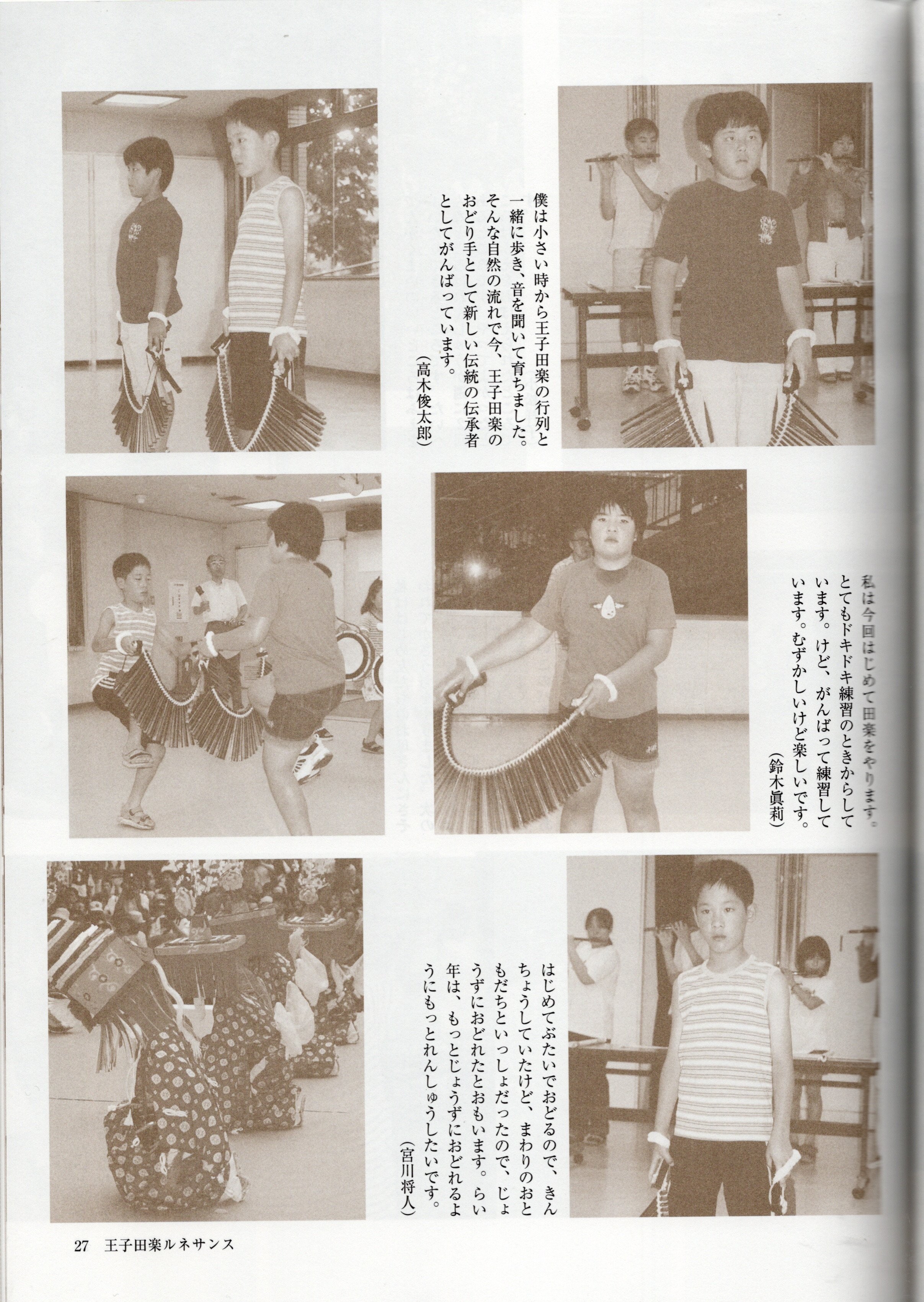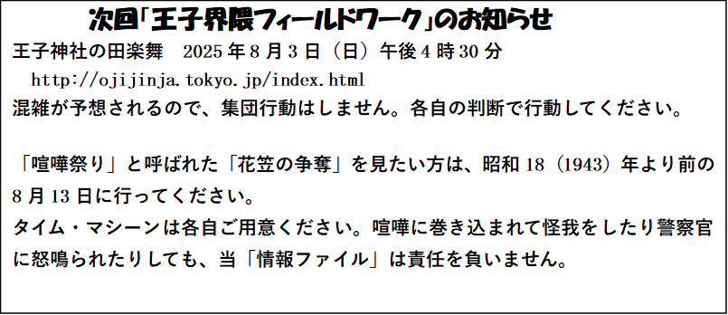 | 板橋の先生- 今回(※1)もまた、詳細な情報提供とともに、「王子田楽」に関する貴重な資料提供に感謝しつつ、興味深く拝読いたしました。 お蔭で、「喧嘩祭り」とも称せられる理由、及びその変遷が理解できました。 また、新たな疑問として、うかがいたいのは、高木助一郎氏の日記(明治42年)に、 「坊主踊」「田楽ハ出家八人ニテ踊ルモノニシテ」とある記述です。 この記述は、『稲付村の話』の「田楽踊の八人の少年が冠る花笠」と、同様に見てよいのでしょうか。 今日も田楽の舞い手は少年達ですが、それにも変遷があったのでしょうか? 明治期は神仏分離であり、そこでの「坊主」「出家」は何を意味するのでしょうか? マニアック― 坊主踊りの「坊主」とは、「田楽法師」だったんじゃないんですか? マレビト- 「坊主(ぼうず)」を検索したら、髪形とか僧侶、米の品種とか- 女将― う~ん…田楽の担い手は誰か? アルフレッド ― 女将さん、またまた資料をひっくり返しています。 女将― 明治初年から昭和18年までの約70年間の、王子田楽というイベントの担い手は、 「主として王子地区の富裕な商家の人たちや、十条地区の旧本百姓層のちの地主層の人たち」(※2)だったのでしょうね。 踊り手については、板橋の先生がご指摘くださったように、高木助一郎日記(※3)には、下記のようにあります。 明治42(1909)年には「坊主踊」「出家八人ニテ踊ル」 明治44(1911)年には「本(もと)ハ出家八人・武者三人ニテ踊リシモノニシテ踊リニ十二番迄アリ、笛太鼓ニテ踊ラシムルナリ、今ハ稚子八人ニ武者三人、稚子ハ六人ハ花ノ付キシ笠ヲカブリ二人ハ筍ノ形シタル笠ヲカブル、…」 昭和の終わりころまで、「坊主」というのは、「出家」=僧侶とは限らず、男の子をさす言葉だったと思います。 「ぼっちゃま」「ぼっちゃん」はよその家の息子を指す丁寧語、今も使う女性がいるかも。 「ぼうや」は、男児や若輩をさす、親しみや軽視を含む、母親や姉が弟を呼ぶとか 「ぼうず」は、年長男性が男児や若輩をさす 自分の息子をさして、父親は「うちのぼうず」、母親は「うちのぼうや」とか いたずらっ子を怒鳴る時は「そこのぼうず!!」。 板橋の先生も、子どもだった頃「ぼっちゃん」って呼ばれたでしょう? マレビト- 日本語って、使い分けが難しいです。 女将― たぶん、助一郎さんの書いた明治末期の人々は男児が踊っているのを見ながら「坊主踊」と呼んでいたのだろうと思います。 そして現在の「王子田楽」は、40年間の空白を経て「復活」した時から、舞童にも楽部(笛)にも女児・女性がいます(※4)。装束と傘で覆われて、見分けられないけれど。 女性は、戦前も裏方・接待を担っていましたが、現在はその「復活」の時から、舞台で演じる一員ともなっています。 王子田楽を担う人間関係は、戦前と、空白後の現在とでは、かなり異なっているようです。7 ![]() ※1 (728)80年 王子田楽 (729) 80年 喧嘩祭 |