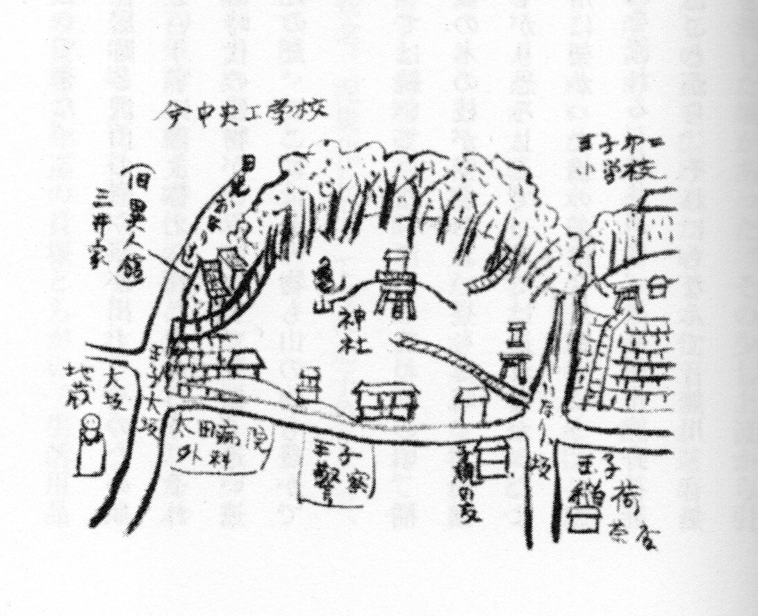 | 女将 ― ちょっと、亀山行ってきます。 アルフレッド― 亀山? 三重県の亀山なら、信楽へ行った(※1)帰りに、亀山駅を通ったでしょう? JR草津線を全線乗るんだって、柘植駅へ出て、JR関西本線に乗り継いだときに。 また行くんですか? 何泊? 女将― 日帰り。 東京都内の北区、JR「王子駅」から線路の西側を北へ台地の裾を歩いて行く「王子界隈フィールドワーク」(※2)の続きです。 前に、行ったときは、葛餅を買ってすぐ、名主の滝へ直行しちゃったんで(※3)。 石鍋秀子さんが描いた昭和5(1930)年頃の地図の左端に「亀山」って書いてある。 おんなじ、秀子さんの本の45頁に、「亀山神社 今中央工学校」という図(添付)があるので、 95年前と2025年現在、比べてみたいな、って。 三太― 中央工学校のHPの、「交通アクセス」https://chuoko.ac.jp/access に、すっごい丁寧な「近郊沿線マップ」がある、東京駅から出発する人ばかりじゃねい、って。 おかあ(=女将)― さらに「キャンパスまでの歩き方」は、スマホの小さい画面じゃあんまり感じないけど、 PCで見ると、わかりやすいし、綺麗で、なんか楽しく歩けそうな気がしてきた。 かんじんの「亀山」って地名が載ってないけど、徳島の「王子神社」も地図に載ってなくても現地に行ったらちゃんとあったし(※4)。 アルフレッド― 「北区 亀山」を検索したら、古墳マニア「ご?ご?ひでりん」さんが訪れてます。(※5) 亀山遺跡は、十条台遺跡群の一部だそうです。 1993(平成5)の『北区史』には、 「「王子稲荷の坂」を登りきった台地上が亀山遺跡である。」とあり、 1955(昭和30)年の調査で、 「弥生時代中期から、古墳時代初期にわたって」「総数25軒の竪穴住居跡、貝塚、古墳周溝などの遺構」が検出されました。(※6)とあります。 「ご?ご?ひでりん」さんによれば、 「亀山は古墳時代前期に造られた前方後円墳なのかもしれません」 おかあ(=女将)― 「ごーごーひでりん」さんの報告は丁寧で鮮明な写真もいっぱい載ってて、現地へ行けないひとに親切。 ただ、「この場所には、王子第二小学校の前身である「亀山小学校」があったそうです。」とあるのは、はて? 卒業生である石鍋秀子さんが、王子第二小学校・通称「王二」と亀山は「いなり坂」で隔てられていると描いているし。 「王二」の現在のHPにも、北区の教育関係資料にも、「王子第二尋常小学校」は1918(大正7)年創立されたとあって、「亀山小学校」という校名が見当たらない、 はて? ※1 (723)80年 信楽火鉢 ※2 (726)80年 イチョウ ※3 (727)80年 名主の滝 〇石鍋秀子『王子に生まれて』 「見返しの地図は、「昭和七年頃の岸町一丁目付近の絵図」 p3「昭和5年頃の岸町界隈」の左端(※3の図) p45「亀山神社」(今号の図)