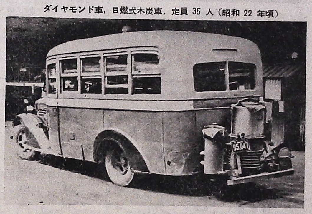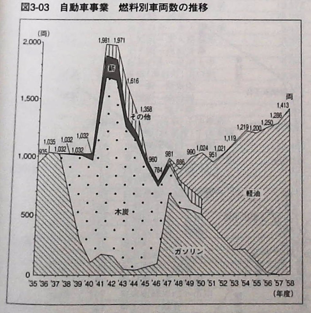 アルフレッド―女将さん、混乱してます。 女将― 前号で、アルフレッドに、「自動車が木炭で動くんですか?」(※1)って聞かれて、 図書館のジロちゃんに相談に行ったら、 絵本の『もくたんじどうしゃもくべえ』(※2)を見つけてくれた。 「このじどうしゃときたら、ふるいじょうようしゃをかいぞうして、うしろはんぶんが、にだいになっているばかりか、しゃたいのよこの、ステップのうえに、おかしなかまがついていました。」 「このおじさんは、カウボーイのぼうしを、かぶっていました。」 カウボーイの帽子をかぶったおじさんは、時代遅れと笑われながら、木炭車のもくべえを東京の下町から走らせる。 渋滞する道路には都電も外車も走ってる、高速道路も新幹線もあり、4-5階建ての集合住宅が建ち並ぶ団地には焼き芋屋も豆腐屋も自動車で出張販売に来てる。 1970(昭和45)年くらいのことでしょうね。 もくべえはスピードが出せないから高速道路は断られるし、エンストはするし、途中でエンジンを冷やして木炭を補給してもらって、急坂はバックでやっと登りきって… カウボーイの帽子をかぶったおじさんは、足柄山牧場の牛や馬がガソリンの臭いを嫌いだからと、もくべえを連れてきたのでした。 アルフレッド― ガソリンでなく石油代用燃料を使う自動車を代用燃料車=代燃車と呼んだんですね。 1934(昭和9)年に商工省が奨励金を出したりして、改造形式は7種類も開発され、代用燃料には、木炭・薪・アセチレンガス、石炭、コークスもあったそうです。(※3) 女将― 代燃車は、エンジン始動に「最低8分から最大50分、平均して20分を要したという」 始動作業に携わる運転手らはこの間、常時一酸化炭素中毒の危険があった。 「運行経路を通じた乗車率や道路の勾配等を先読みし、送風機や、煙突に設けた弁を操作する高度な技量が求められた。急勾配を控えるルートでの運行は、事に困難を極めた。」 名古屋市電気局では「ガソリン自動車ト異リ木炭ノ詰込、瓦斯発生炉ノ取扱其ノ他種々煩瑣ナル操作ヲ要スルヲ以テ」運転手には特別手当を支給した(※3-1)。 東京市電気局では、昭和8,9(1933,34)年よりガソリン価格高騰に、市バスの運転手に「燃料節約手当」までだしていましたが、ガソリン規制・代用燃料化という国策に沿って、昭和12年から木炭車に切り替えて行きます。 「木炭車の増加を数字で示すと、昭和13年度末に356両、同14年度には728両、15年度末には870両と増加し、16年度末には在籍車両1981両の75%を占める1516両にまで達し、昭和18年度末にはガソリン車がわずか50両にまで減少した。」(※3-2、『60年史』p334) 木炭も不足して、東京市電気局は自家製炭事業も開始しました。 ![]() (左):1947(昭和22)頃、木炭車『東京都交通局50年史』 1961、p213 (中):1935-1958(昭和10-33)「自動車事業 燃料別車両数の推移」『東京都交通局100年史』2012、p147 (右):『女車掌の手記』氏家富美子、厚徳社、1942 1938~41(昭和13~16)年頃の市バスの営業所の朝、木炭車を担当する乗務員たちの会話―(※4『女車掌の手記』より) 朝6時に出勤カードを捺した車掌・百合ちゃんに、運転手・田口さんが 「おい百合ちゃん、今日は車の調子が良いぜ、一昨日はどうも調子が悪くて苦心したよ、昨日の中休にやっと故障の原因がわかったんだよ、車の調子が悪いと僕まで神経衰弱になりそうだよ」 同僚が次々と出庫していくのを見送りながら、二瓶運転手と組む車掌・ふみちゃんは 「出庫時間はもうとっくに過ぎてゐるのにまだ私は呼ばれないわ」 「二瓶さん故障なのか知ら、まだ呼ばないのよ」 「まあ二瓶さんなの、私昨日組んだけれど故障ばかりして嫌になっちまったわ、二瓶さんの木炭車近頃調子が悪いのね、ぢゃお先へ、路線で逢ひませうね」 ふみちゃんが、送車掛に言われて車庫の奥へ見に行くと、 作業服を着た二瓶さんは木炭車の釜に炭を入れて長い金棒(かなぼう)でさかんに突ついてゐた、車の傍には炭俵が五俵ばかり積んであった。幾台か並んだ木炭車の所々に掃き寄せられた粉炭が山になってゐる。空俵や油できたなくべろべろによごれた襤褸(ぼろ)が二号車庫とのさかひの隅に無造作におっぽり投げられて重なってゐた。炭をあけるたびにパッパッと上る炭煙(すみけむり)のひどい埃を浴びながら釜に炭を入れる作業服姿の運転手さんの顔は誰も彼も皆んな炭だらけであった。 「二瓶さん、お早う御座居ます。どうまだ出られそうもない?」 二瓶さんはひょいと振り返って 「やあ、お早う、今日はふみちゃんか、まだまだ三十分ばかり待ってもらはうか、その内エンジンも掛ると思ふが」 「まあひどい埃、此処に居ちゃ顔が真黒になってしまふわ、二瓶さんの顔はまるで黒ん ぼ見たいよ、木炭車は大変ね」 半布(ハンカチ)で口をおほひ乍ら、思わず二瓶さんの炭だらけの顔に同情してしまった、二瓶さんはやうやく釜のふたをしめ乍ら 「エヘヘヘヘヘ」 と独特の嬉しげな笑ひ方をした。 「ふみちゃん、二瓶さんも国策にそって木炭車